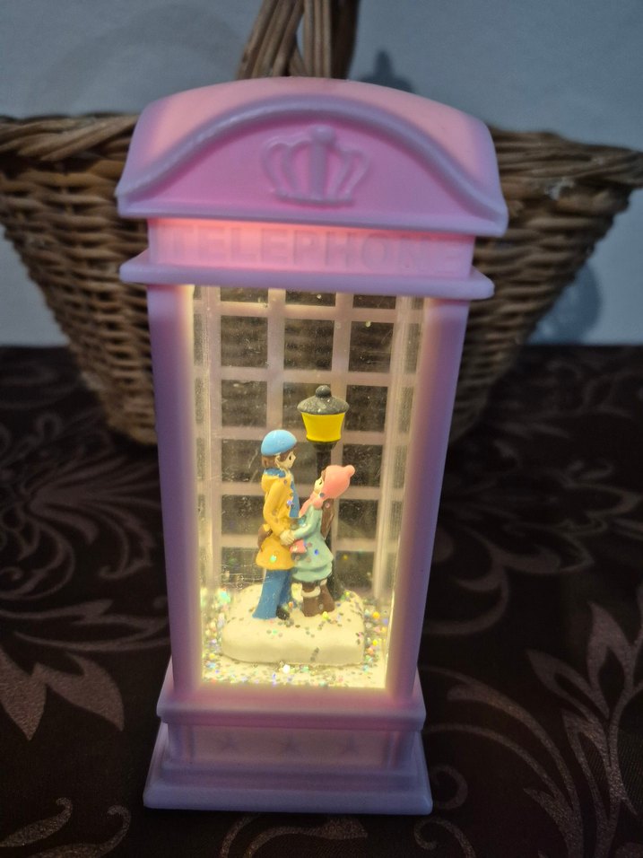 Canlı renkli pembe telefon kulübesi figürü, içinde detaylı karakterler barındırır. Işıklı özelliğiyle dekoratif bir görünüm sunar.