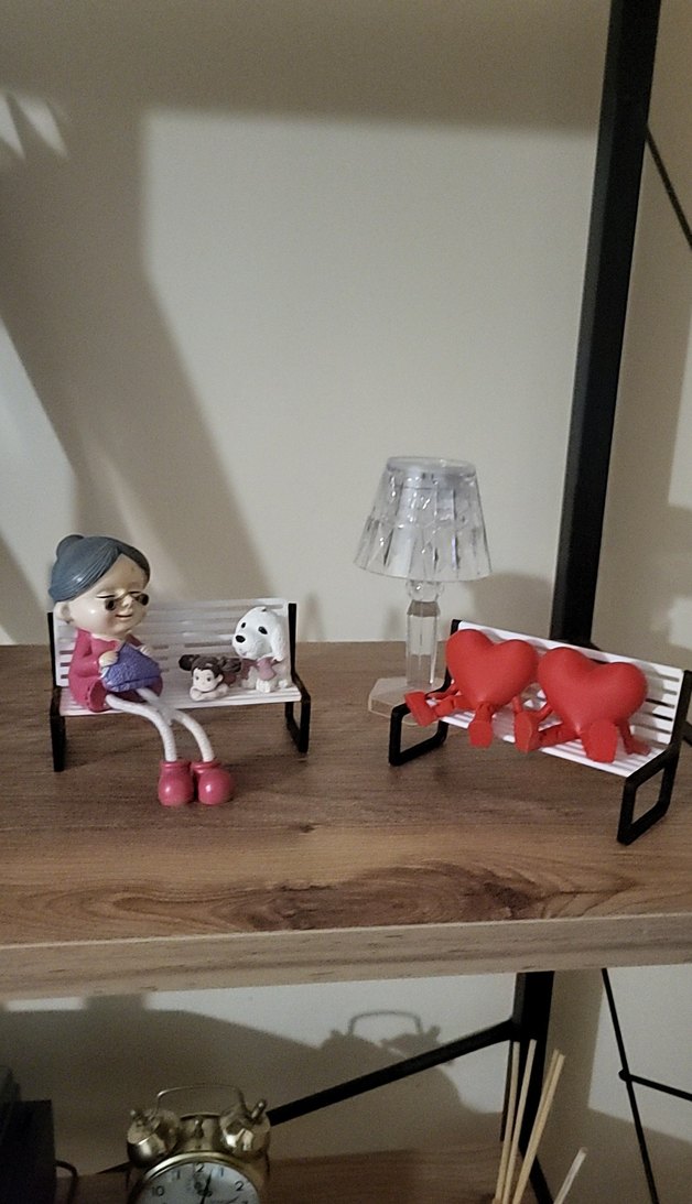 Bir bankta kız ve köpek figürü, diğer bankta iki kırmızı kalp figürü ve aralarında küçük şeffaf bir lamba bulunan dekoratif set.