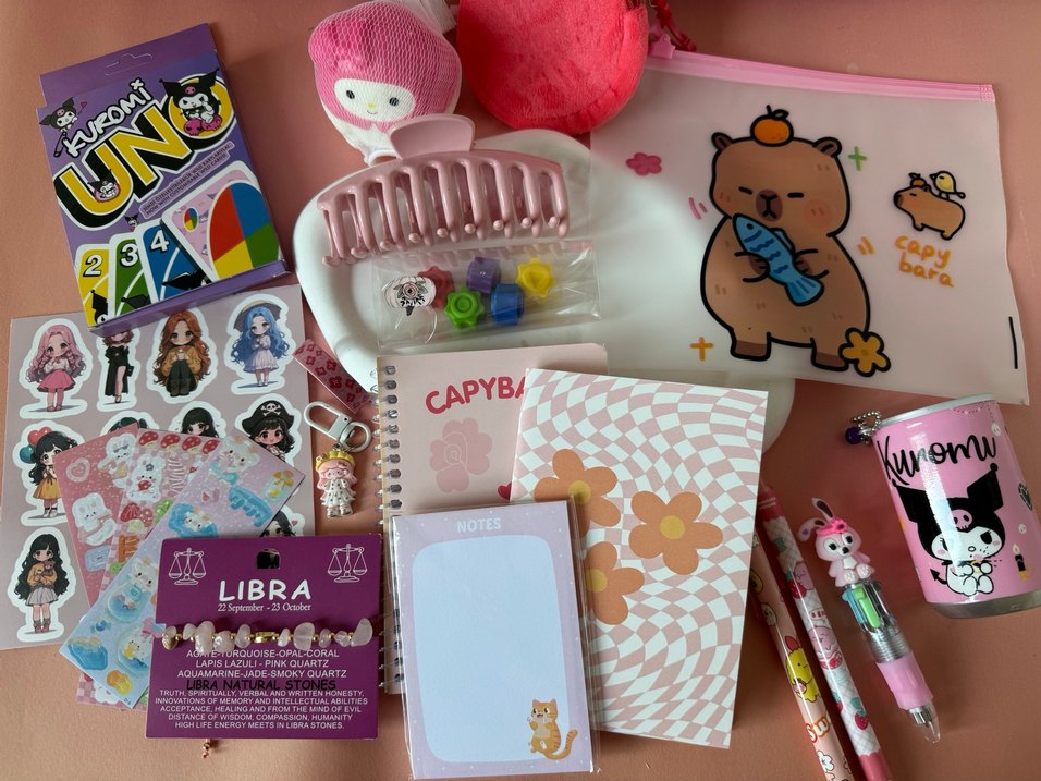 Pastel pembe, baskılı ve dantel detaylı kız aksesuar seti. Bohem, retro tarzını yansıtan saç tokası, defterler ve sevimli küçük aksesuarlar içerir.