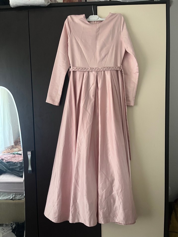Pembe renkte tesettür abiye. Regular fit kesimi ve modern klasik, minimalist tarzı ile düğünler için uygundur. 38 bedendir sadece arkasında etek ucunda mürekkep gibi lekesi vardır.