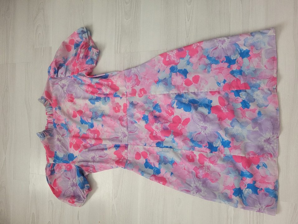 Pembe pastel tonlarında tie-dye desenli, bisiklet yakalı ve kısa kollu bol kesim elbise Fırfır detaylı ve midi boyda, vintage ve bohem tarzı bir arada sunar.