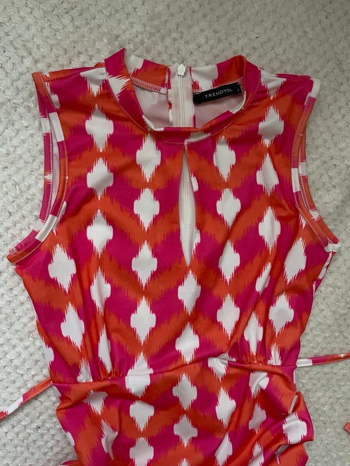 Pembe renkli, renkli tie-dye desenli, kolsuz, bisiklet yakalı, vücuda oturan ve fermuarlı detaylı mini elbise. Sentetik kumaştan, günlük kullanım için uygundur.
