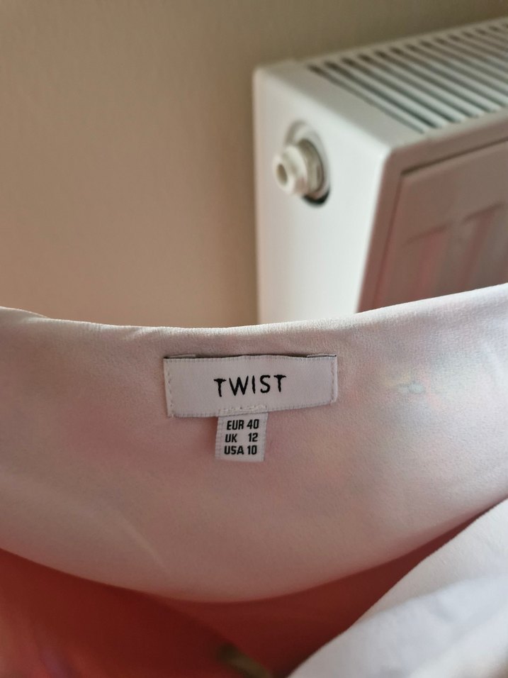 Pembe tie-dye desenli, normal midi boy, vücuda oturan hemşire korsesi. Marka etiketi üzerinde 'TWIST' yazıyor.