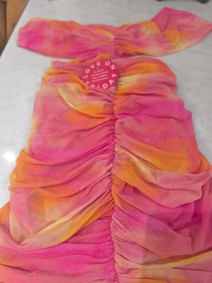 Pembe pastel tonlarda tie-dye desenli, straplez ve kolsuz, drapeli uzun kadın elbisesi. Bohem tarzda, düğün için uygun.