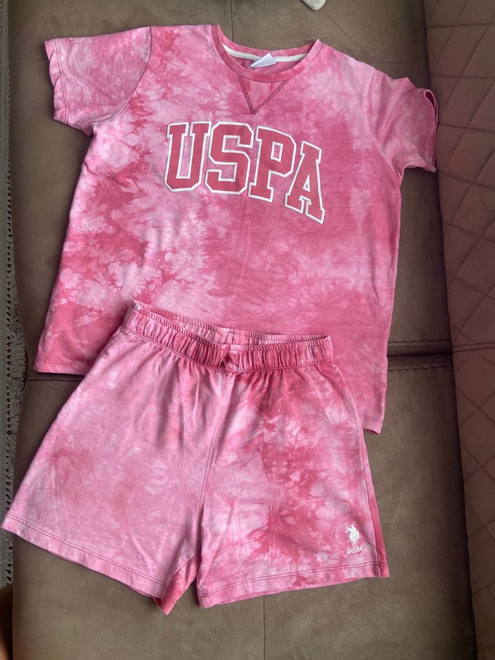 Pembe tie-dye desenli takım, kısa kollu ve yuvarlak yakalıdır. Yumuşak kumaştan, rahat ve salaş kesimlidir. USPA logosu ile sokak stilini yansıtır. Çok az giyildi, hiçbir kusuru yoktur.