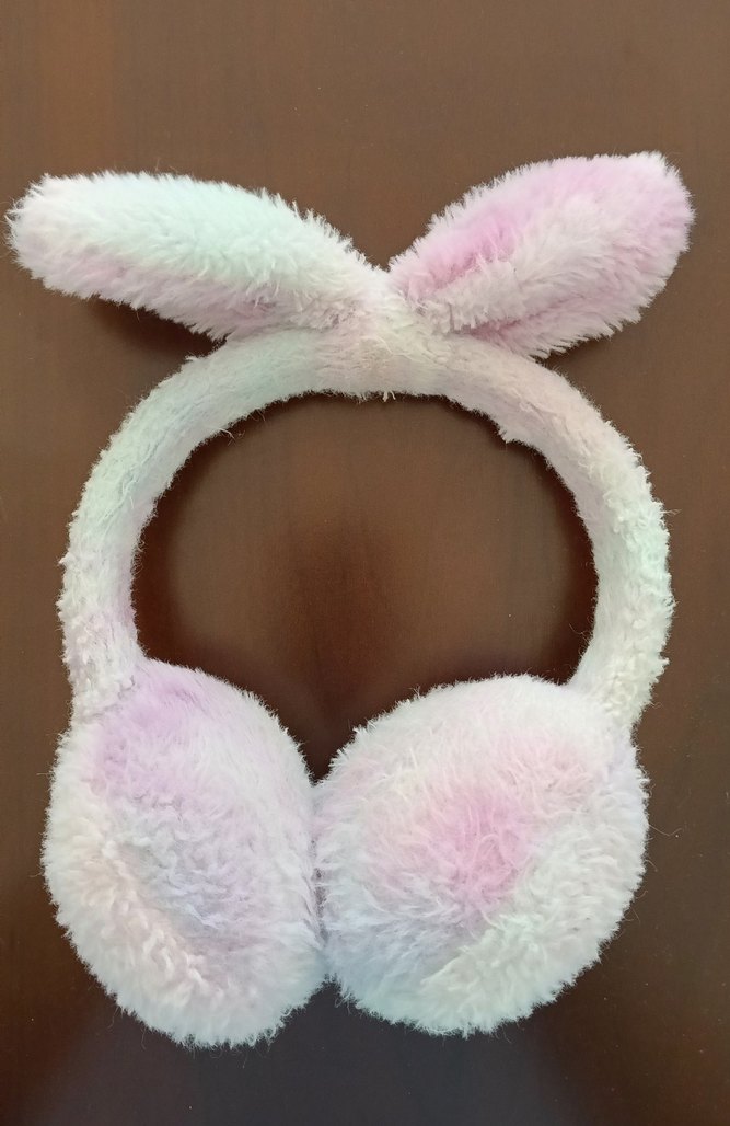 Pembe pastel tonlarda tie-dye desenli, tavşan kulaklı ve yumuşak kürklü kulaklık.