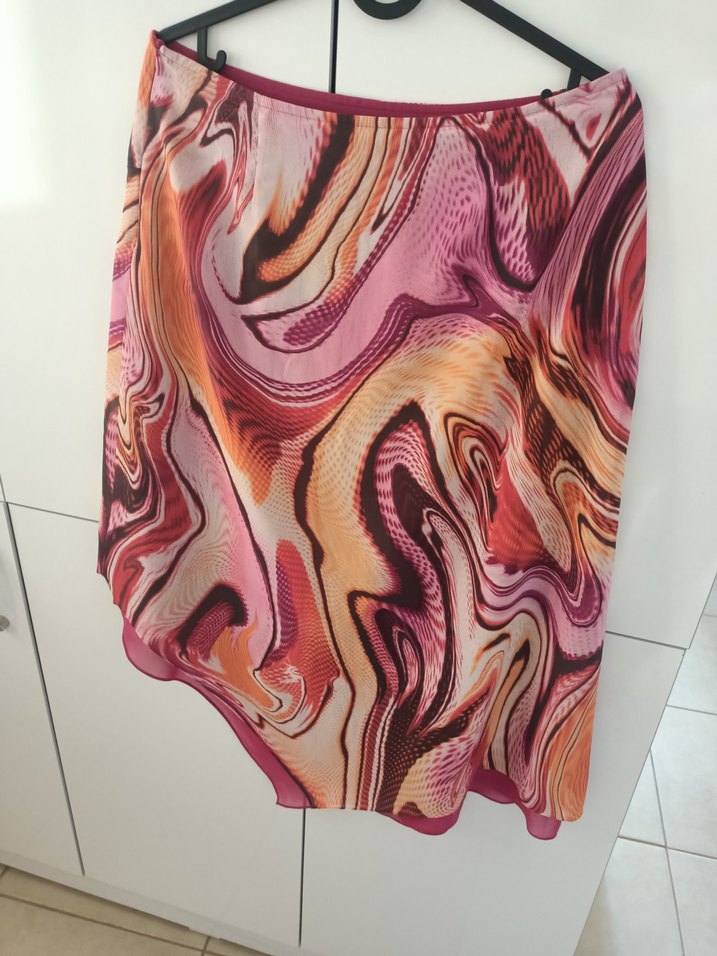 İpek gibi parlak kumaştan, pembe tie-dye desenli, drapeli, bol kesim midi etek ,bohem tarzda parti için uygun.