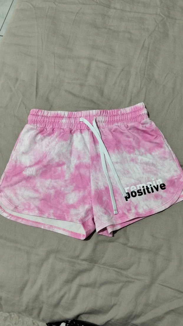 Pembe tie-dye desenli, bol kesim ve lastikli mini şort. Yumuşak sentetik kumaştan, önünde 'positive' yazısı bulunur. Rahat sokak stili için uygun.