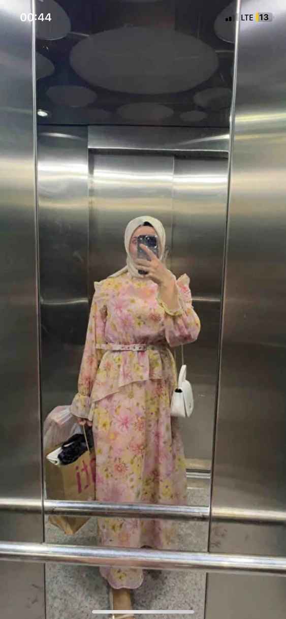 Pembe tie-dye desenli, yüksek yakalı, uzun kollu, bol kesim transparan detaylı uzun elbise. Hafif sentetik kumaştan, mütevazı sokak stili için uygun.