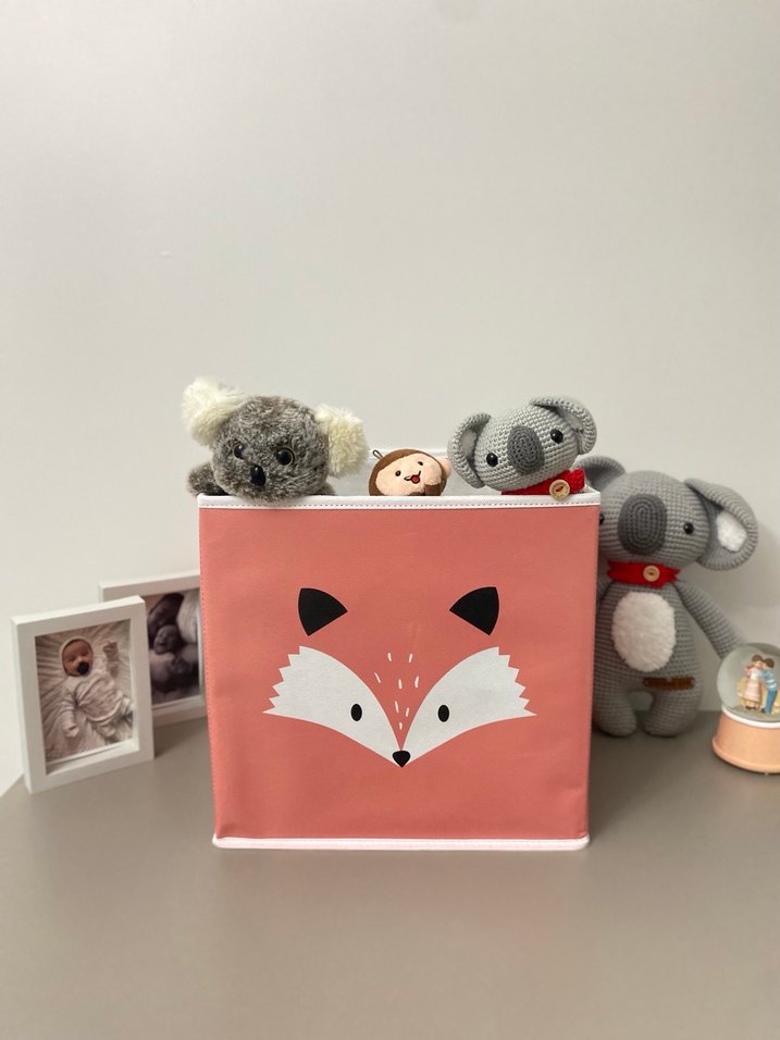 Pembe rengi ve tilki yüzü desenli, oyuncak veya küçük eşyalar için uygun, yumuşak ve esnek yapıda depolama sepeti. İç kısmı gri renklidir.