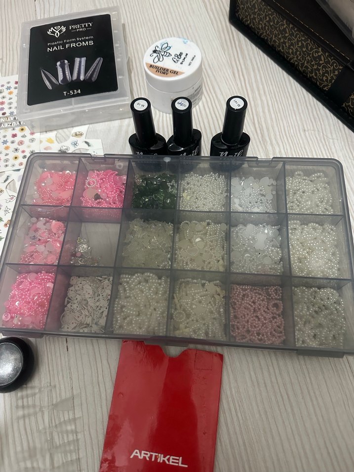 Pembe ve açık renkli çeşitli tırnak süslemeleri, tırnak jelleri ve kalıplar içeren set. "ARTIKEL" ve "NAILFROMS" etiketlidir. Ürün kullanılmıştır. Takma tırnak Üst form şablonları Tırnak yapıştırıcısı Kelebek şablon Çeşitli tırnak charmları Çelitli tırnak dövmesi Ayna tırnak tozu İnci tozu Tırnak jeli az miktarda Base primer top coat az miktarda Kalıcı oje siyah kırmızı beyaz Uv kurutma cihazı Hepsi toplu bi şekilde satılıktır.