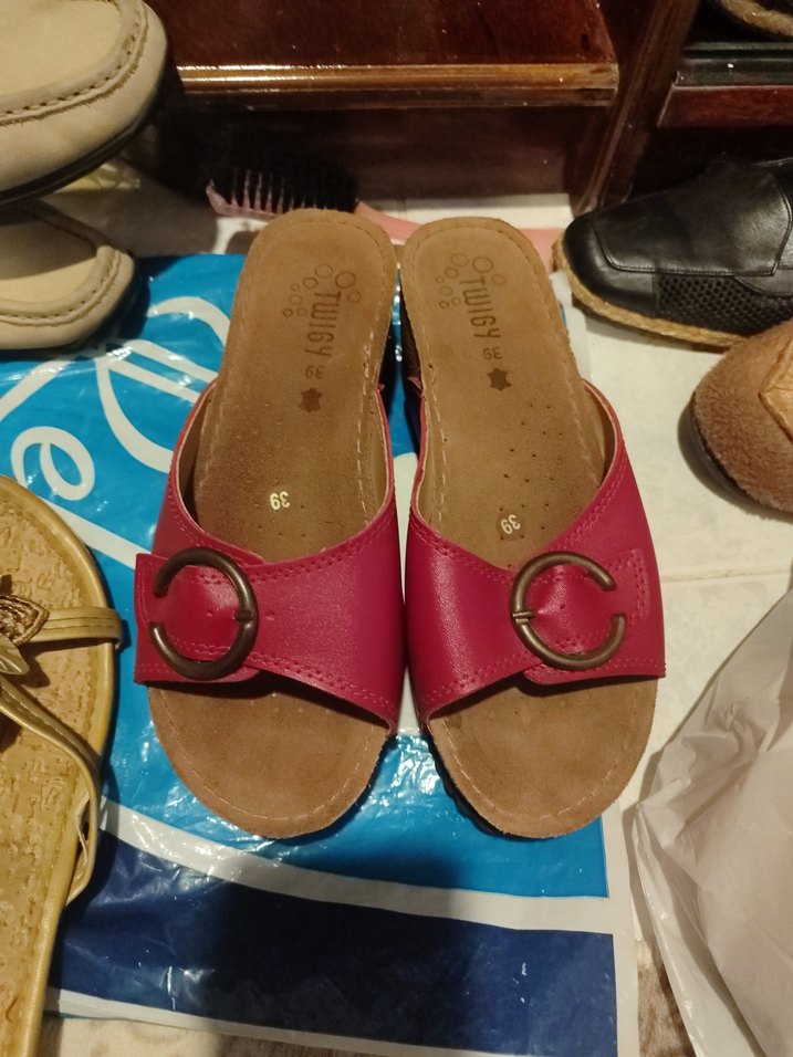 Pembe tokalı, dolgu topuklu kadın terlik. Kauçuk malzemeden yapılmış, renkli ve baskılı casual tarzda günlük kullanım için uygun.