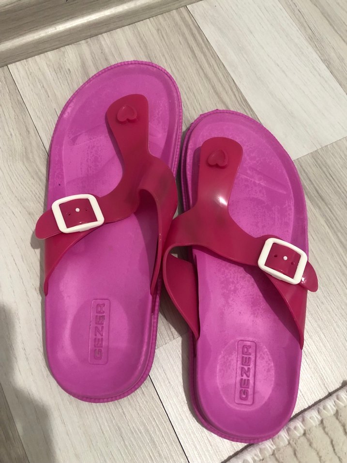 Pembe renkte, tokalı, düz tabanlı kadın terlikleri. Kauçuk malzemeden yapılmış, günlük kullanım için sade ve renkli tasarım. Plaj için uygundur