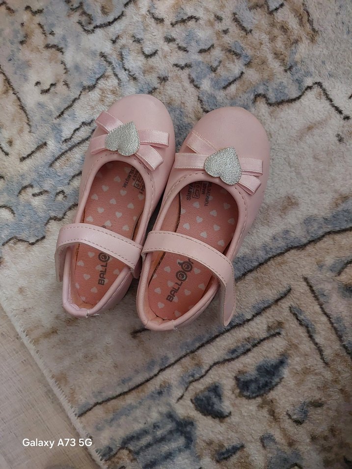 Pembe tokalı, kalp süslemeli kız çocuk babet ayakkabı. Kauçuk malzemeden, yumuşak pastel tonlarda. 2 3 sefer giyiildi defosu yoktur
