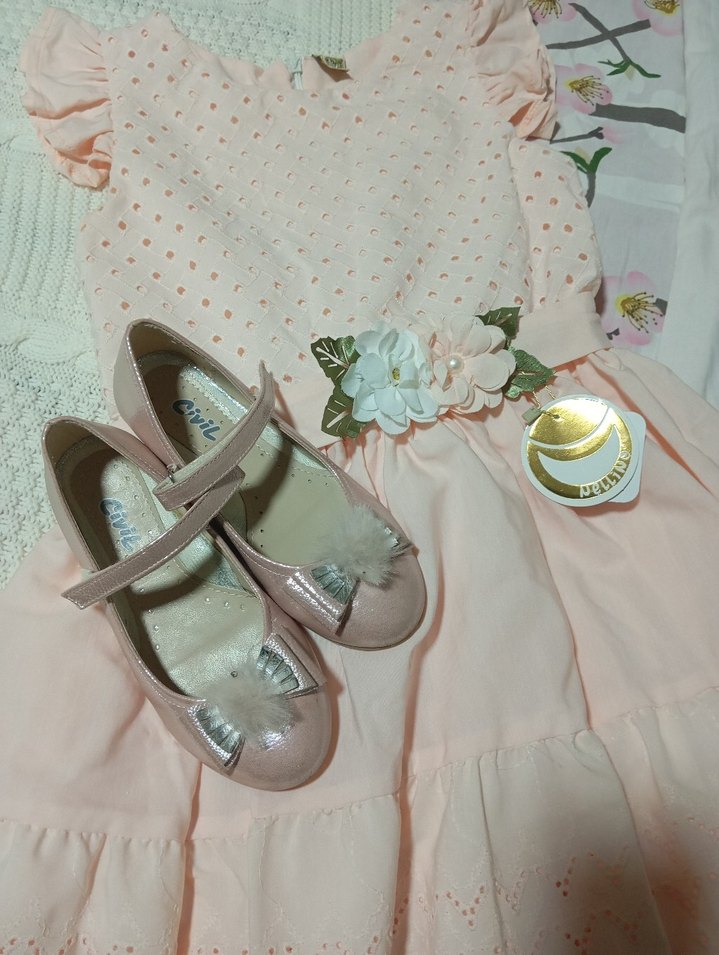 Pastel pembe renkte, tokalı ve kauçuk malzemeden yapılmış kız çocuk babetleri, sade ve klasik bir stile sahiptir. elbise etiketi üstünde hiç giyilmedi fiyat ikisi içinde elbise 10 yaş için uygundur