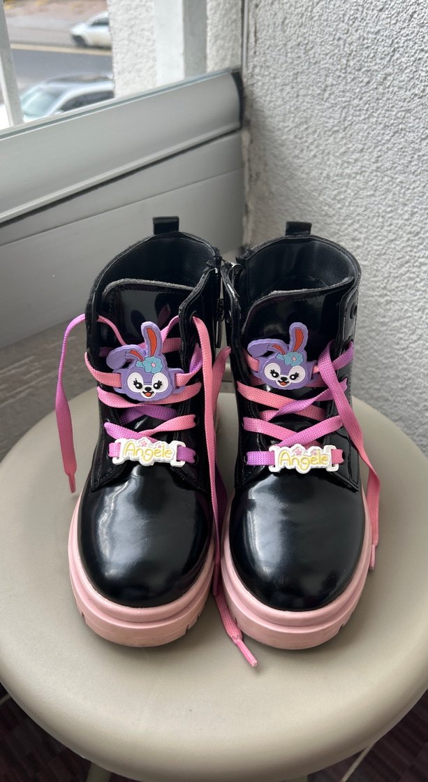 Parlak siyah kauçuk malzemeden yapılmış, pembe tabanlı ve bağcıklı kız çocuk goth botları. Tokalı detaylar ve renkli baskılı karakter süslemeleri içerir. #kızçocukbot #siyahbot Bir kaç defa giyildi sorunu yoktur☘️