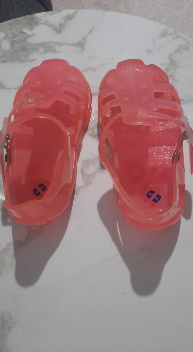 Pembe renkte, tokalı ve renkli görünüme sahip kauçuk kız çocuk sandaletleri, desen içermemektedir. Avant-garde ve trend belirleyici tarz için uygundur.