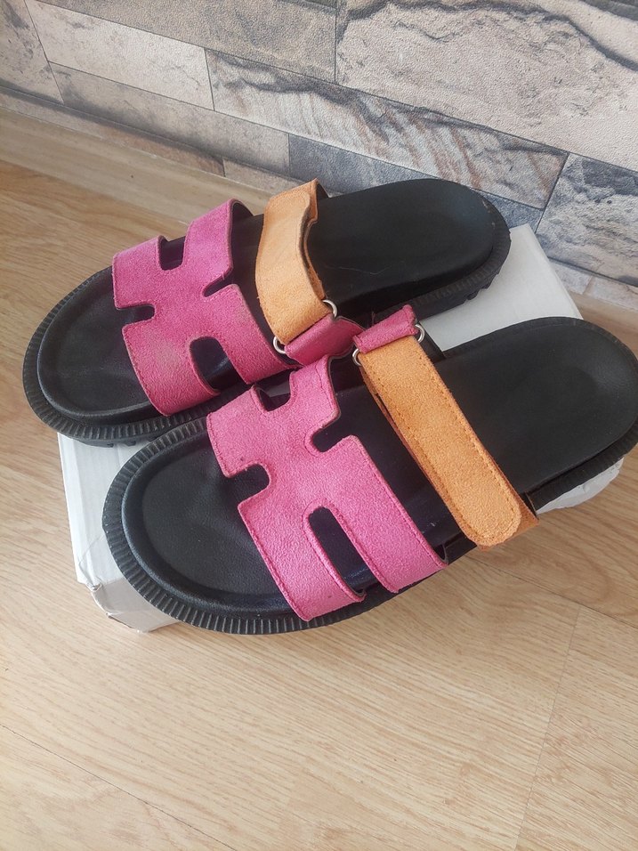 Pembe ve turuncu tokalı, platform topuklu kauçuk kadın terlikleri, minimalist ve sokak stili için uygun.