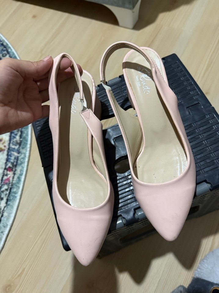Pembe tonlarda, tokalı bantlı, lastik tabanlı stiletto kadın ayakkabısı, günlük kullanıma uygun normcore stilinde.