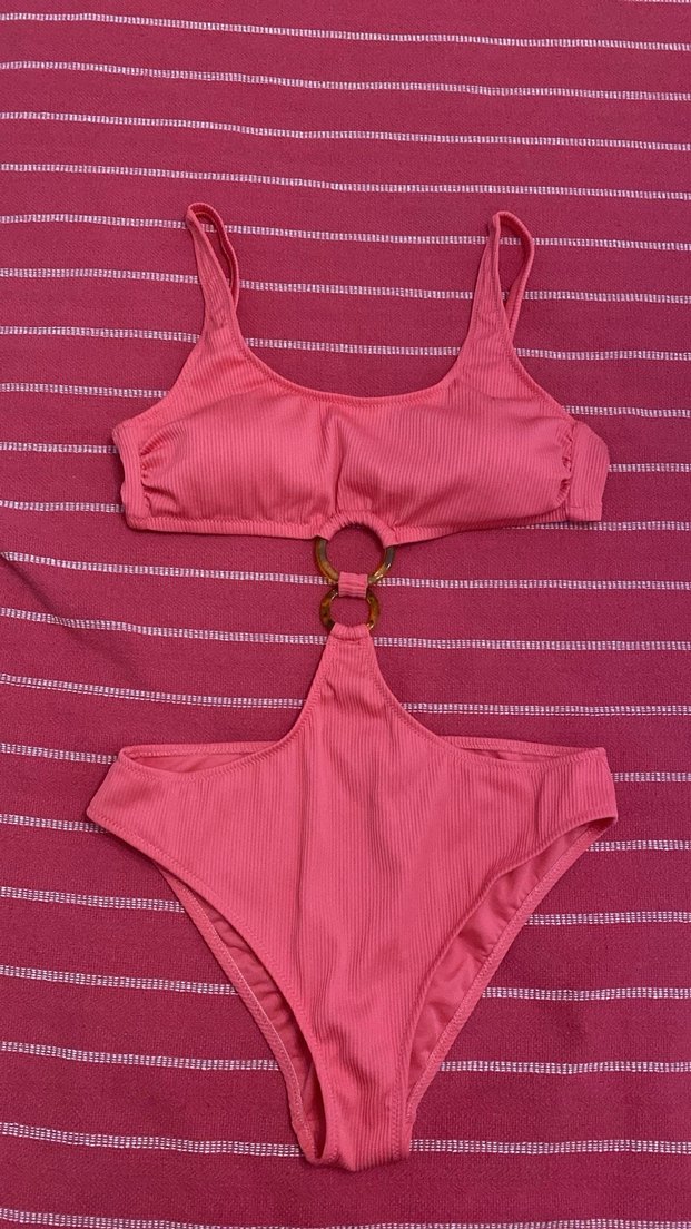 Pembe tonlarda, tokalı halka detaylı, strappy askılı ve vücuda oturan kadın mayokini. neon pembe renkte LCW 38 BEDEN sorunsuz az giyildi