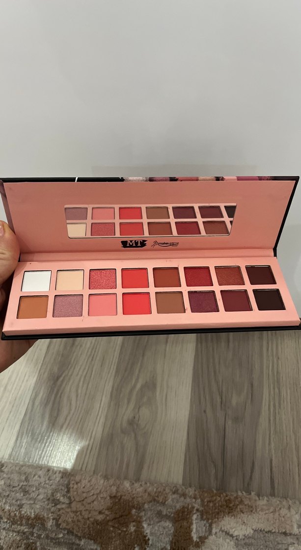 Pembe ve sıcak tonlarda, mat ve ışıltılı göz farlarından oluşan palet, uygulama için ayna içerir.