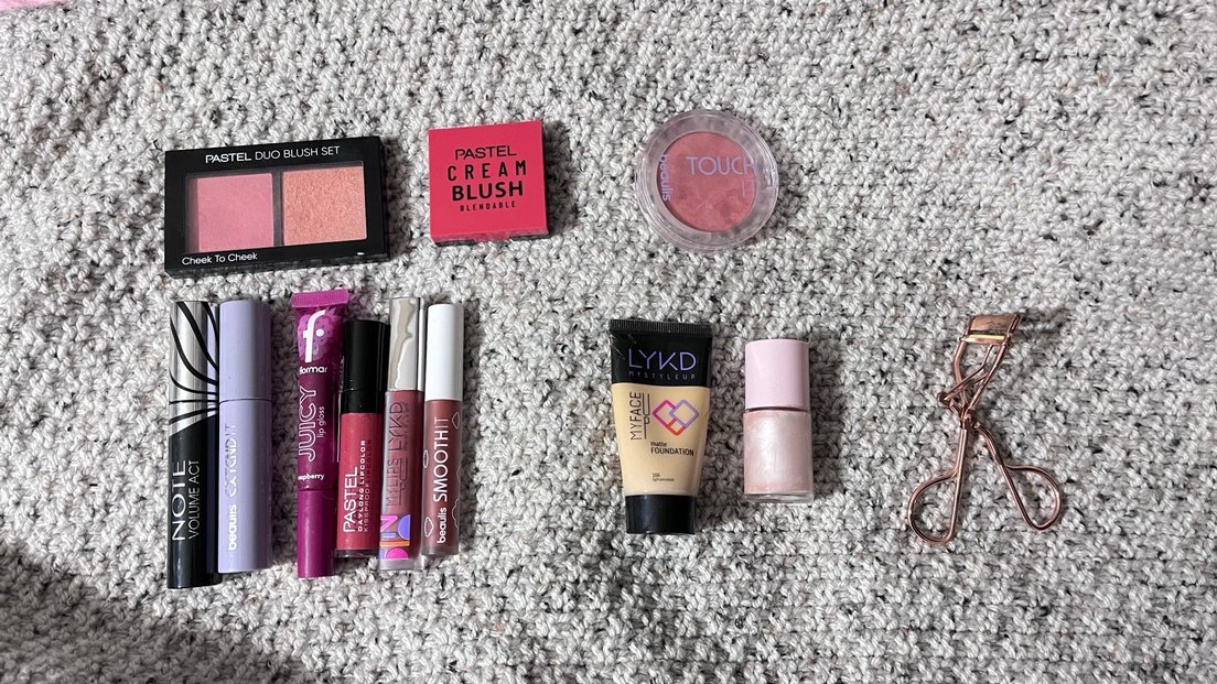 Hafif pembe tonlarda maskaralar, allıklar, 'JUISY' etiketli lip gloss, fondöten ve kirpik kıvırıcıdan oluşan makyaj seti.kirpik kıvırıcı yok