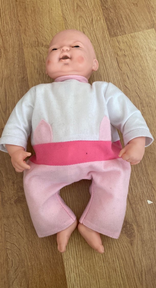 Yumuşak beyaz ve pembe kıyafetli, pastel pembe tonlarında bebek oyuncak, parlak pembe kemer detaylıdır.