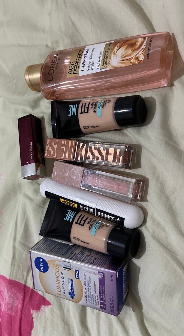 Açık pembe tonlarında fondöten, ruj ve cilt bakım ürünlerinden oluşan makyaj seti.
