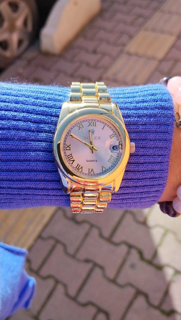 Pembe pastel kadranlı, Roma rakamlı kadın kol saati. Altın renkli metal kayış ve pembe tonlarında boncuklu bileklik içerir. ⌚
