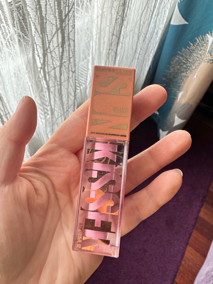 Şeffaf dikdörtgen şişede, pembe tonlu likit allık. Rose gold kapak ve önde büyük yazılar bulunur.