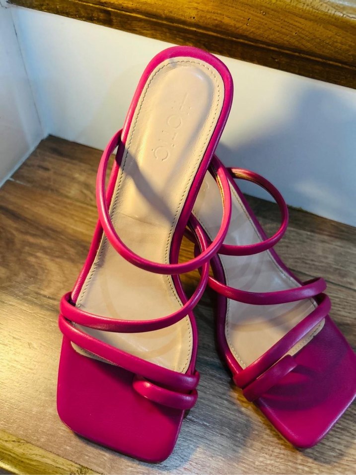 Parlak pembe renkte, topuklu ve tokalı ince kayışlara sahip kadın sandalet. Minimalist ve cesur tarz için uygundur.