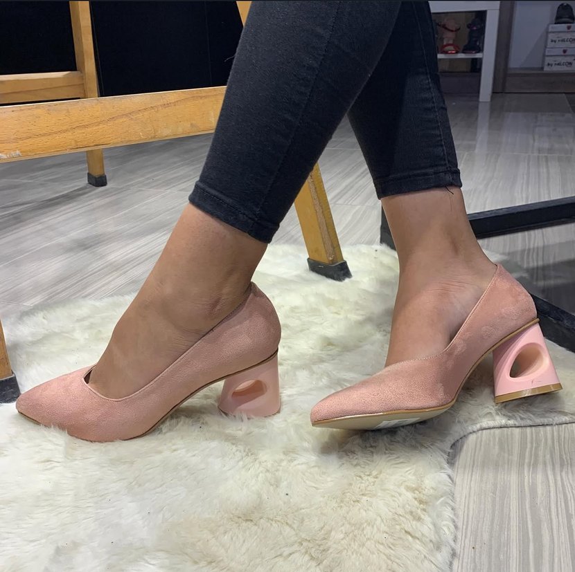 Pastel pembe blok topuklu, düz tasarımlı kadın stiletto. Ofis için rahat ve şık bir seçim.