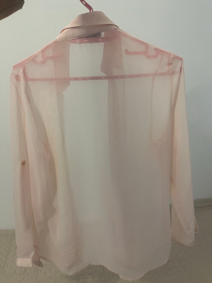 Pembe, transparan, ipeksi kumaştan, yakalı ve uzun kollu, midi boyda, bol kesim kadın gömleği. Ofis ve sokak tarzına uygun.