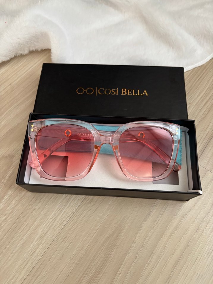 Cam rengi pastel pembe, şeffaf çerçeveli kadın güneş gözlüğü. Çerçevesi dikdörtgen. Çerçeve materyali kemik. Ekartmanı tam bilmiyorum ancak 54 civarıdır muhtemelen çünkü büyük oldukça çerçeveleri. Uv400 koruması yoktur. Hiç kullanılmamıştır. Kutulu gönderilecektir.
