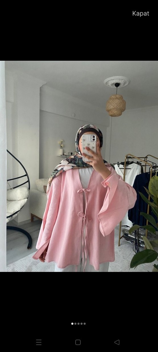 Pembe pastel renkte, uzun kollu, halter yakalı, hafif keten kumaştan yapılmış, bağcıklı ve şeffaf midi uzunlukta bol kesim kimono.