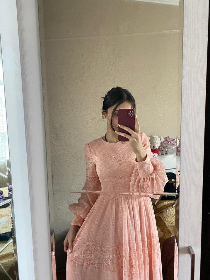 Pembe Transparan Uzun Kollu Kadın Elbise