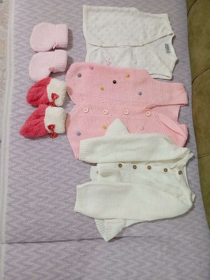 kıyafet lerde kullanıma bağlı leke ve tülermeler vardır. patiklerde sorun yoktur. 1 adet uzun kol hırka. 2 adet yelek 2 adet patik. 6/9 ay karışık tır. markaları karışıktır.