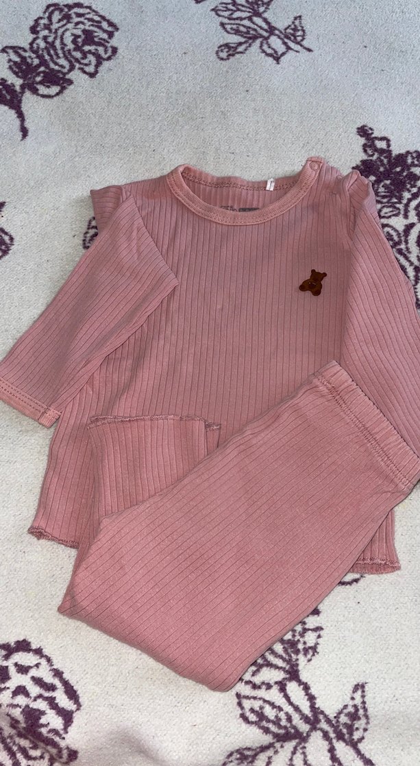 Pembe pastel renkte, triko uzun kollu üst ve eşofman altından oluşan bebek kız takımı. Üstte küçük ayı detayı bulunur.