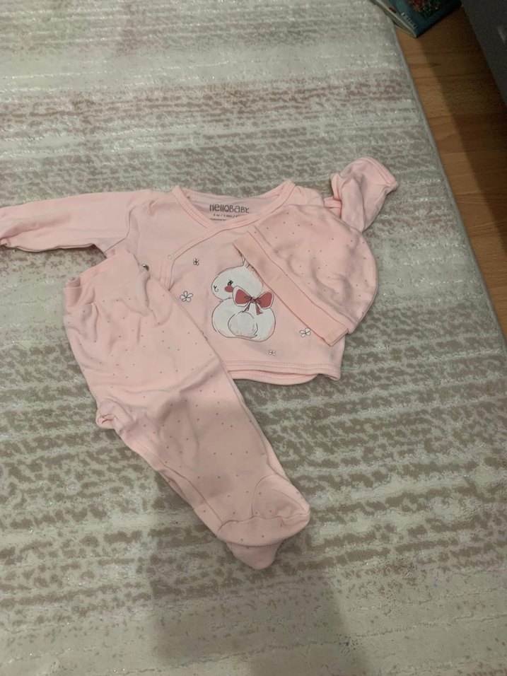Pastel pembe renkte, uzun kollu, yumuşak triko kumaştan yapılmış bebek kız takımı. Üstünde ördek baskısı, uyumlu pantolon ve şapka bulunur.