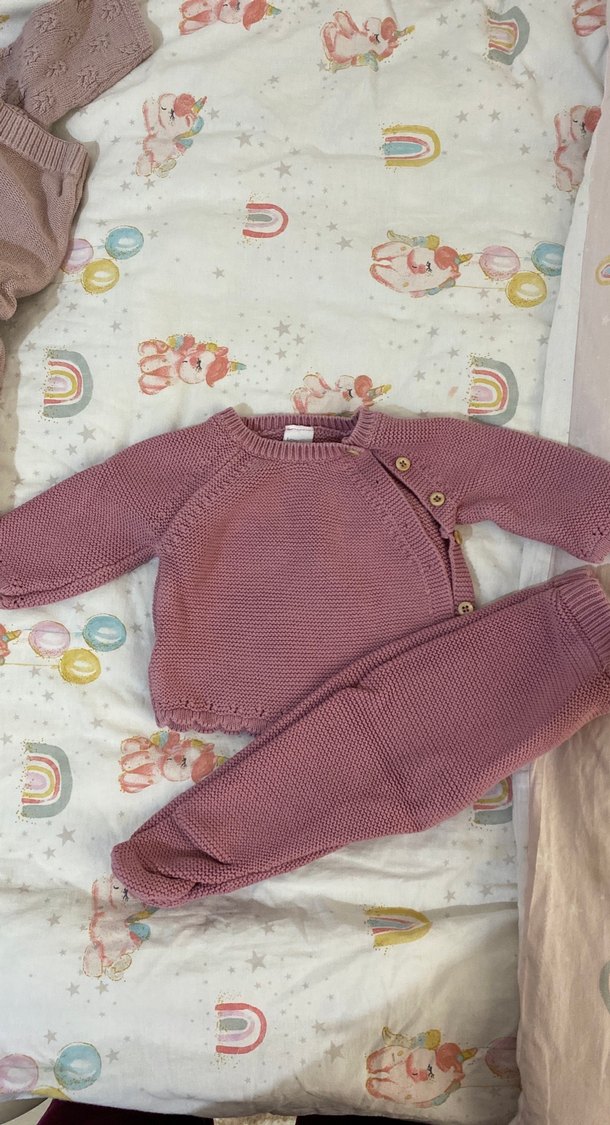 Pastel pembe renkli, triko uzun kollu üst ve uyumlu pantolondan oluşan bebek kız takımı.