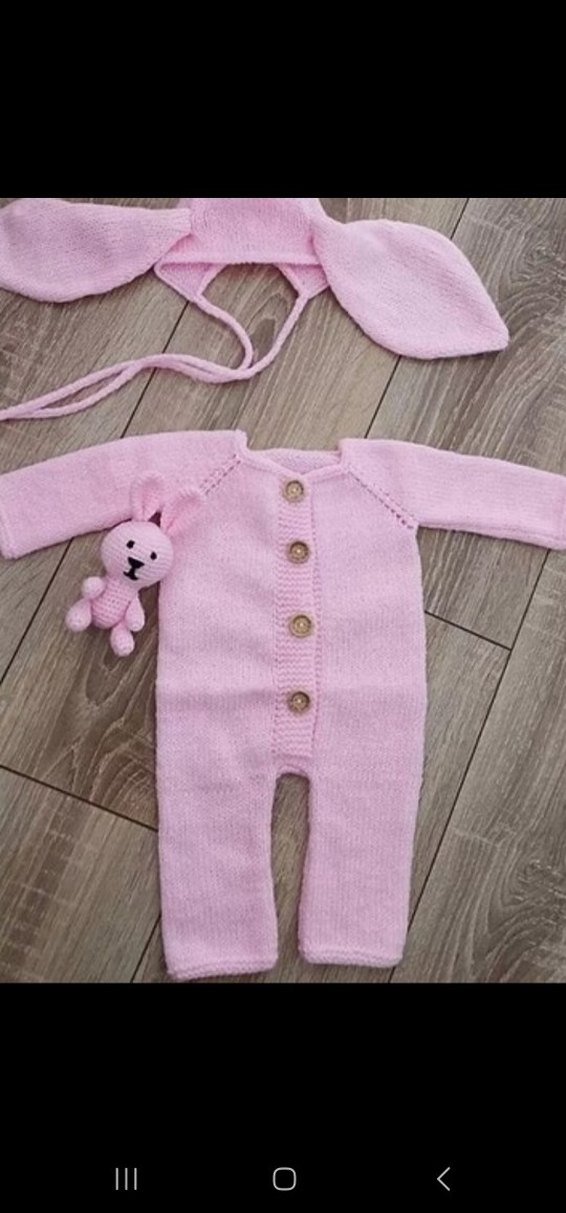 Pastel pembe, uzun kollu, düğmeli triko bebek tulumu ve kulaklı uyumlu şapka seti.