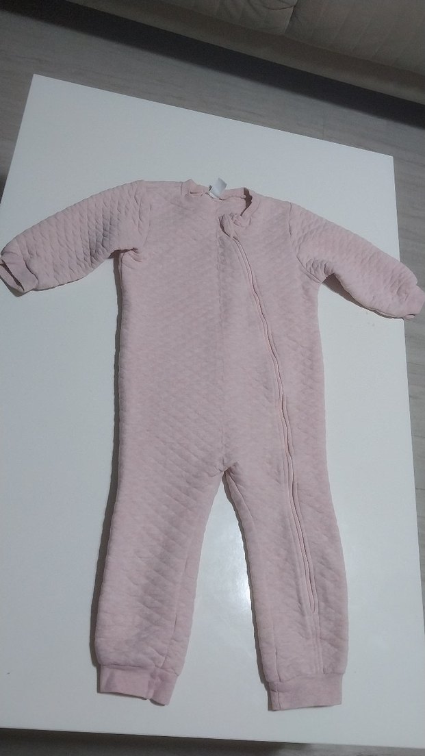 Pastel pembe renkte, triko dokulu ve yuvarlak yakalı, bebeğiniz için sıcak tutan tulum. ❄️