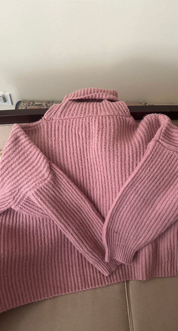 Pembe triko, boğazlı ve uzun kollu, yumuşak dokulu, normal boyda ve pastel tonlarda, günlük rahat kullanıma uygun kadın kazak.