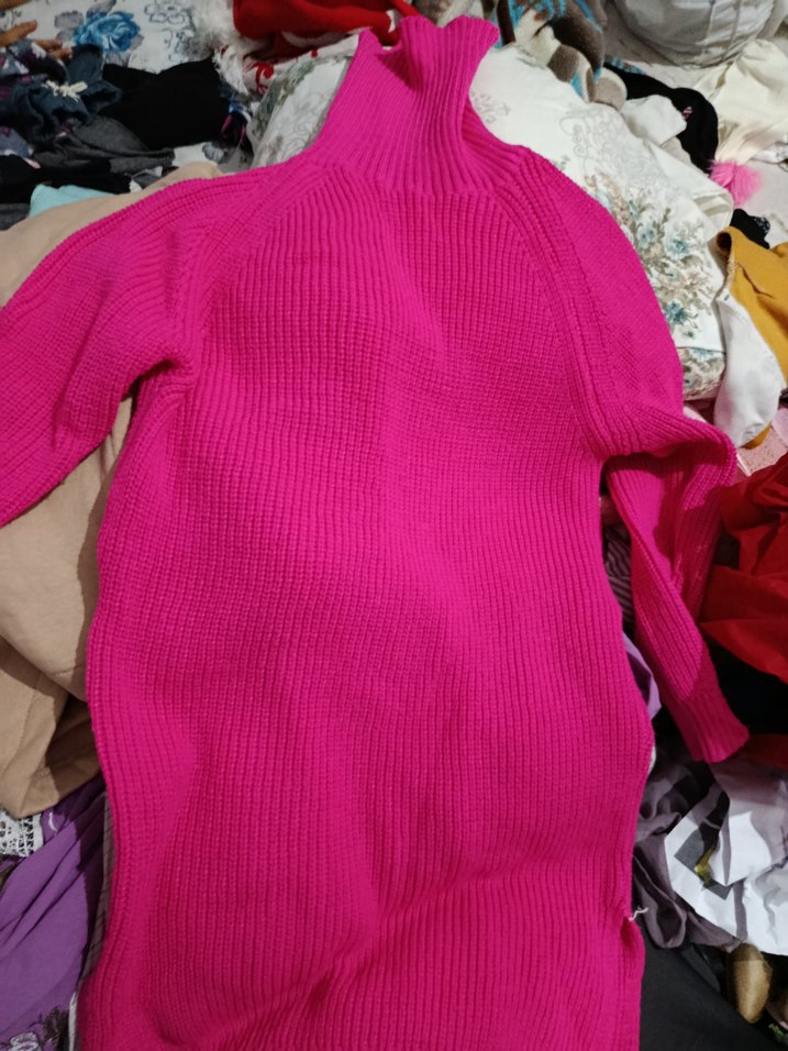 Pembe renkte, triko örme, boğazlı ve uzun kollu, normal boyda, rahat bir kadın kazağıdır. Sokak stili ve günlük kullanım için uygundur.