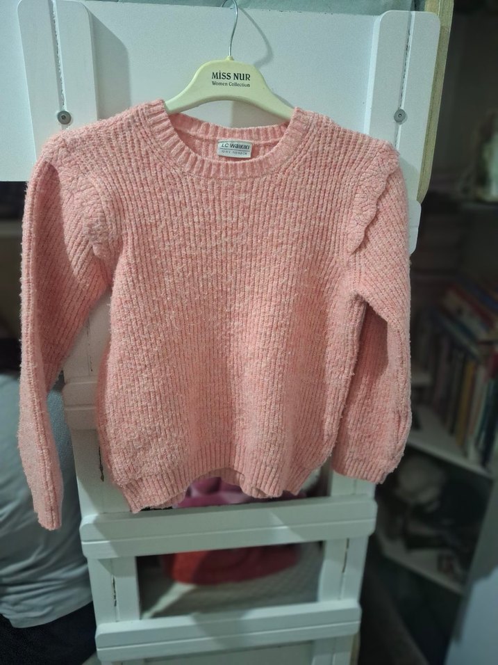 Pembe renkte, yuvarlak yaka ve uzun kollu, triko dokuma çocuk kazak. Rahat kesimi ve pastel rengiyle günlük kullanıma uygun, konforlu bir parça.