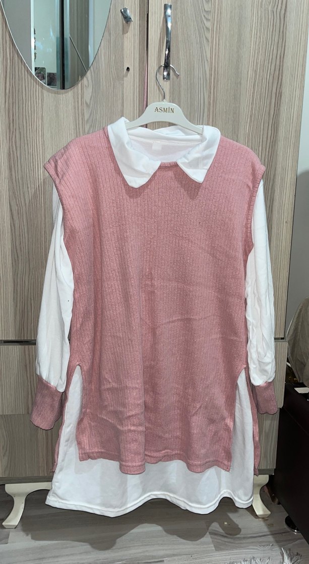 Pamuklu, uzun kollu, yakalı kadın bluz. Pembe triko detaylı, bol kesim, midi boy, desen içermeyen rahat bir modeldir.