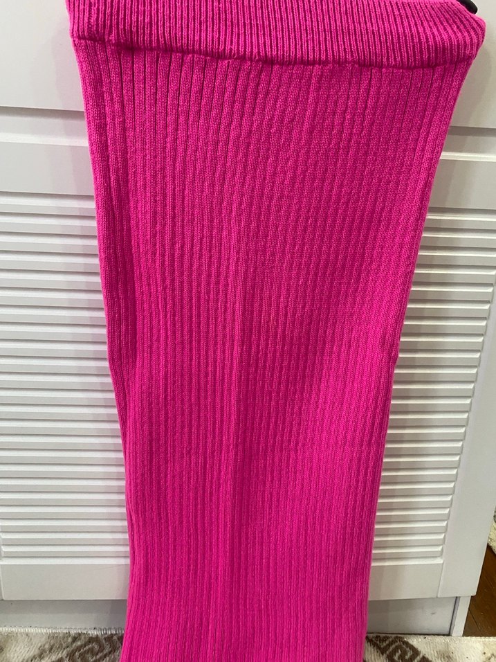 Pembe renkli, triko dokulu, uzun ve vücuda oturan takım. Kayık yaka ve askılı kollara sahip, yumuşak sentetik kumaştan üretilmiştir. Rahat ve renkli bir gündelik stil sunar.
