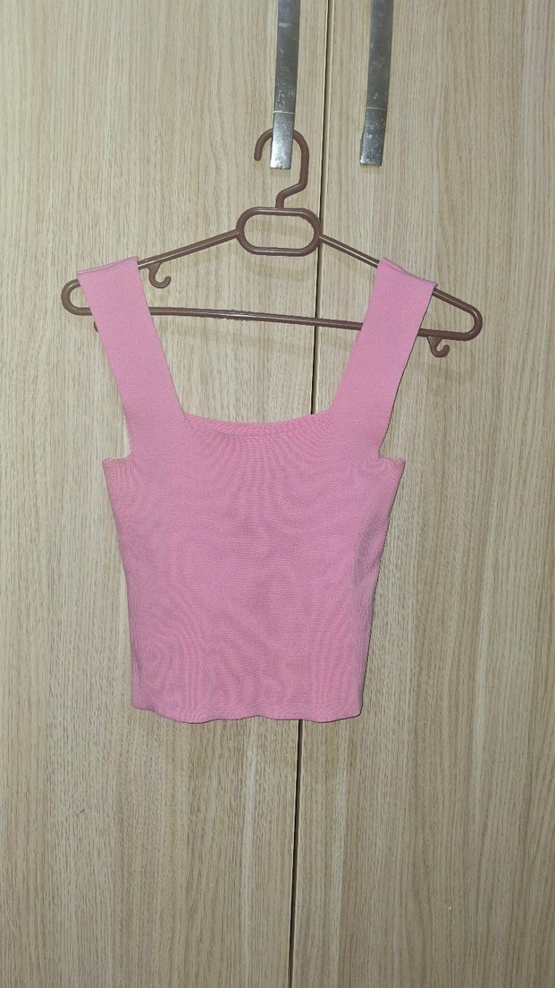 Pembe pastel tonlarında, triko kumaştan, düz yaka ve kolsuz, vücuda oturan midi uzunluğunda kadın atlet. Minimalist ve günlük sokak stiline uygun.