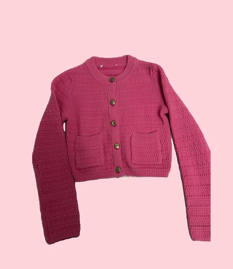 Pembe triko kadın hırka, uzun kollu ve yuvarlak yaka. Giymeyi umarak etkiketini koparmıştım ama giyemedim yepyeni.