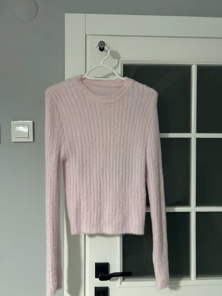 Pembe pastel tonlarda, uzun kollu, fitted kesim ve bisiklet yaka olan yumuşak triko kadın kazak. Günlük rahat kullanıma uygundur.